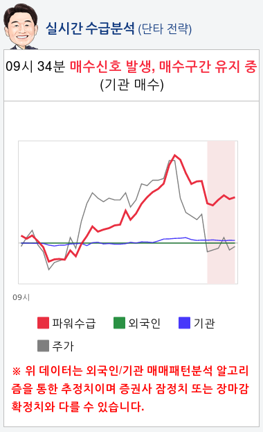 외국인, 기관 수급을 보면 외국인은 매수전환하고 있고, 기관은 매수전환하였다. 알파고는 외국인, 기관의 추가 매수 가능성을 80%로 예상하고 있다.