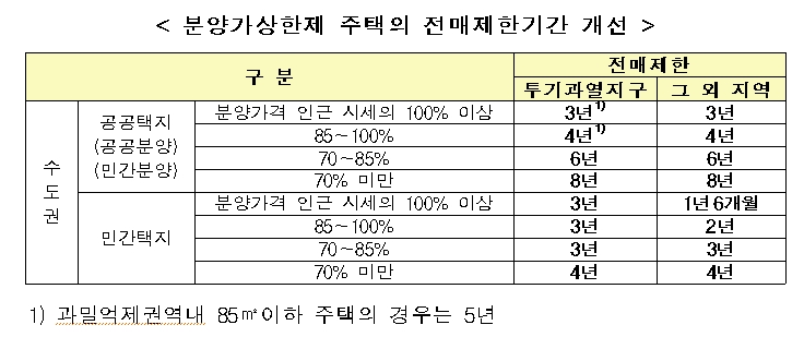 수도권에서 건설·공급되는 분양가상한제 주택 전매제한기간은 개발제한구역 해제비율, 주택면적에 관계없이 최대 8년까지 강화됩니다.