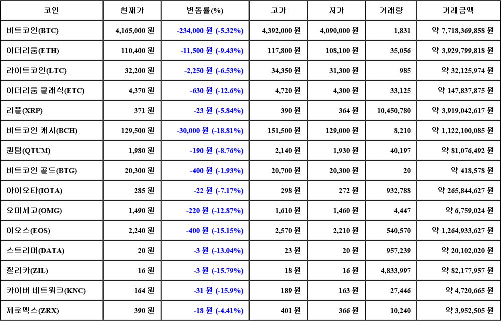 또한, 카이버 네트워크(-15.9%, 164원), 질리카(-15.79%, 16원), 이오스(-15.15%, 2,240원), 스트리머(-13.04%, 20원), 오미세고(-12.87%, 1,490원), 이더리움 클래식(-12.6%, 4,370원), 이더리움(-9.43%, 110,400원), 퀀텀(-8.76%, 1,980원), 아이오타(-7.17%, 285원), 라이트코인(-6.53%, 32,200원), 리플(-5.84%, 371원), 제로엑스(-4.41%, 390원), 비트코인 골드(-1.93%, 20,300원)은 하락세를 보이고 있다.