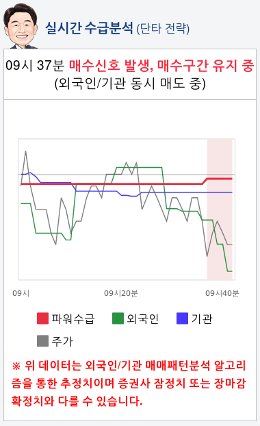 외국인, 기관 수급을 보면 외국인은 2일 연속 매도하고 있고, 기관은 수급이 없다. 알파고는 외국인, 기관의 추가 매도 가능성을 18%로 예상하고 있다.