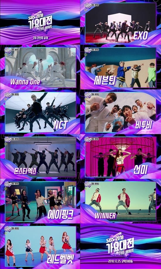 오는 25일(화) 개최되는 `2018 SBS 가요대전`이 1차 라인업 공개에 이어 2차 라인업을 공개해 화제다. 포털과 홈페이지, SNS를 통해 공개된 2차 라인업 티저에는 엑소(EXO), 워너원(Wanna One), 레드벨벳, 위너(WINNER), 에이핑크, 선미, 몬스타엑스, NCT, 세븐틴, 비투비 등이 이름을 올렸다.
