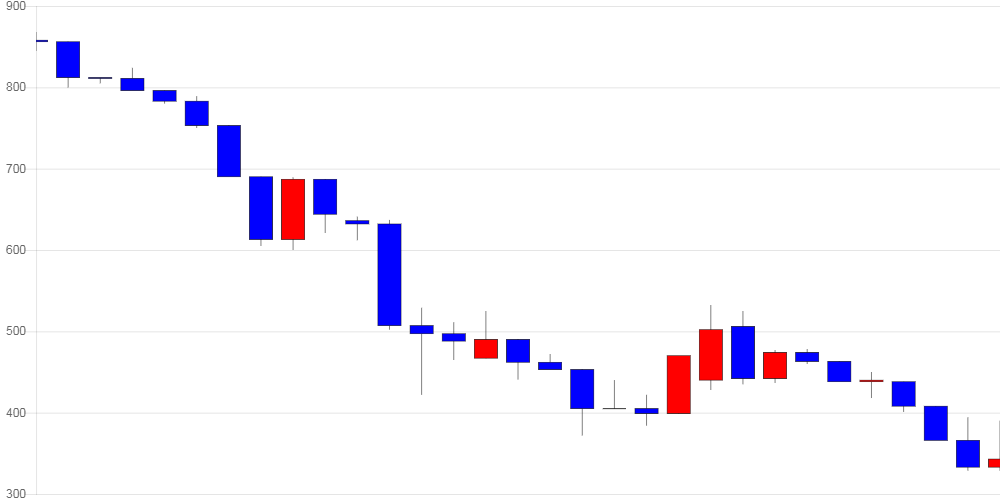 최근 1개월 고점은 868원이었으며, 현재 가격은 고점 대비 39.4% 수준이다.