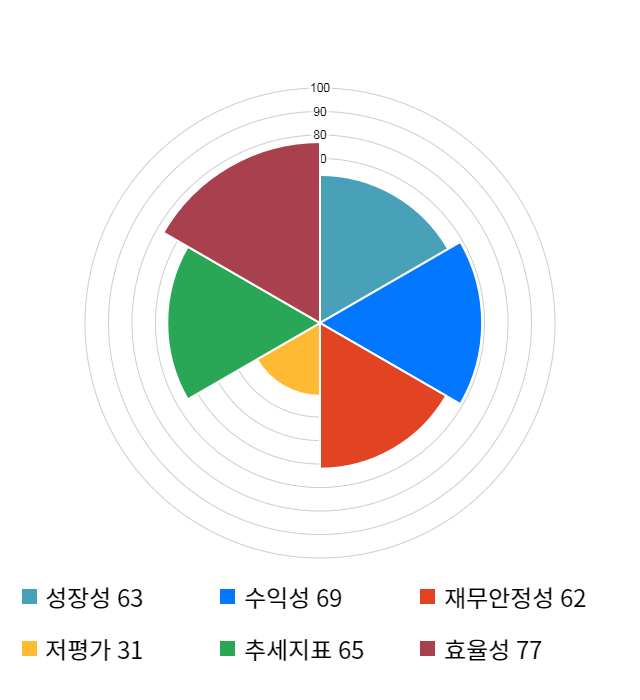 AI 인공지능 종목 분석 시스템을 이용해 성장성, 수익성, 효율성, 안전성, 저평가성, 추세 등 주가 수익률에 영향을 줄 수 있는 6가지 핵심 투자 지표를 점수화하여 종목의 투자 매력도를 계산해보았다.