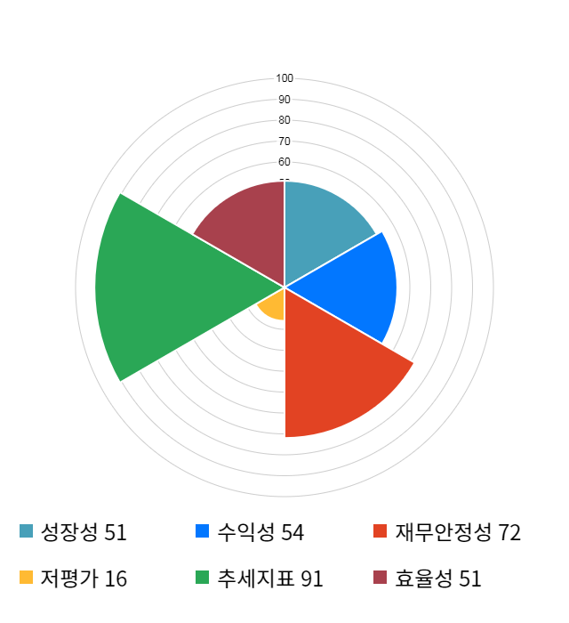 AI 인공지능 종목 분석 시스템을 이용해 성장성, 수익성, 효율성, 안전성, 저평가성, 추세 등 주가 수익률에 영향을 줄 수 있는 6가지 핵심 투자 지표를 점수화하여 종목의 투자 매력도를 계산해보았다.