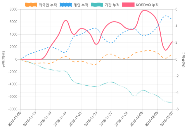 최근 한달간 투자자별 매매동향을 살펴보면 개인과 외인의 매수세가 두드러졌다.