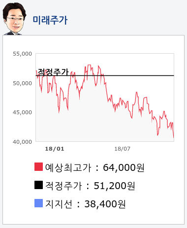 알파고의 재무데이터 분석 결과에 따르면 적정주가는 51,200원을 예상하고 있으며, 목표주가는 64,000원, 지지선은 38,400원 으로 예상하고 있다.