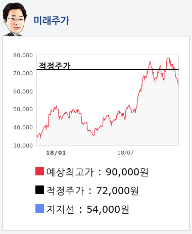 알파고의 재무데이터 분석 결과에 따르면 적정주가는 72,000원을 예상하고 있으며, 목표주가는 90,000원, 지지선은 54,000원 으로 예상하고 있다.