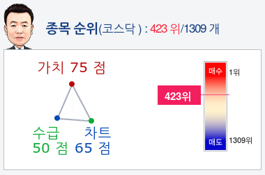 알파고가 가치, 수급, 차트로 평가한 포스코켐텍종목의 현재 종합순위는 코스닥 1309개 종목 중 423위로, 알파고는 포스코켐텍기업의 가치을 높게 평가 분석하고 있다.
