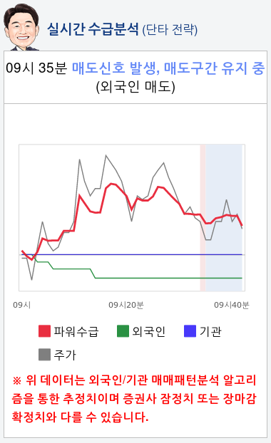 알파고가 분석한 이엠코리아 종목의 외국인·기관 당일 실시간 수급은 현재 외국인은 매도하고 있고 기관은 관망하고 있으며, 종합 수급분석 평가지표인 파워수급은 09시 35분 부터 현재까지 매도 에너지가 더 높은 것으로 분석하고 있다.