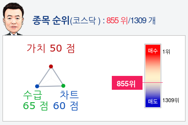 알파고가 가치, 수급, 차트로 평가한 파멥신종목의 현재 종합순위는 코스닥 1309개 종목 중 701위로, 알파고는 파멥신기업의 차트을 높게 평가 분석하고 있다.