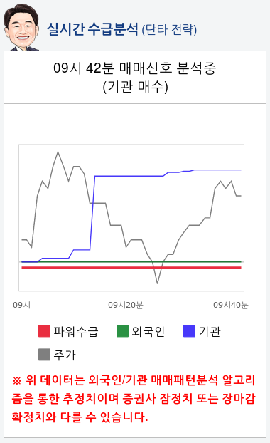 알파고가 분석한 파멥신 종목의 외국인·기관 당일 실시간 수급은 현재 외국인은 관망하고 있고 기관은 매수하고 있으며, 종합 수급분석 평가지표인 파워수급은 09시 00분 부터 현재까지 추정이 불가한 것으로 분석하고 있다.