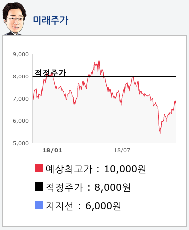 알파고의 재무데이터 분석 결과에 따르면 적정주가는 8,000원을 예상하고 있으며, 목표주가는 10,000원, 지지선은 6,000원 으로 예상하고 있다.