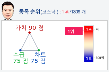 알파고가 가치, 수급, 차트로 평가한 인선이엔티종목의 현재 종합순위는 코스닥 1309개 종목 중 1위로, 알파고는 인선이엔티기업의 가치와 수급와 차트을 높게 평가 분석하고 있다.