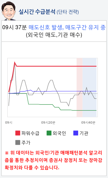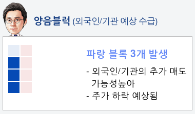 외국인, 기관 수급을 보면 외국인은 3일 연속 매도하고 있고, 기관은 2일 연속 매도하였다. 알파고는 외국인, 기관의 추가 매도 가능성을 60%로 예상하고 있다.
