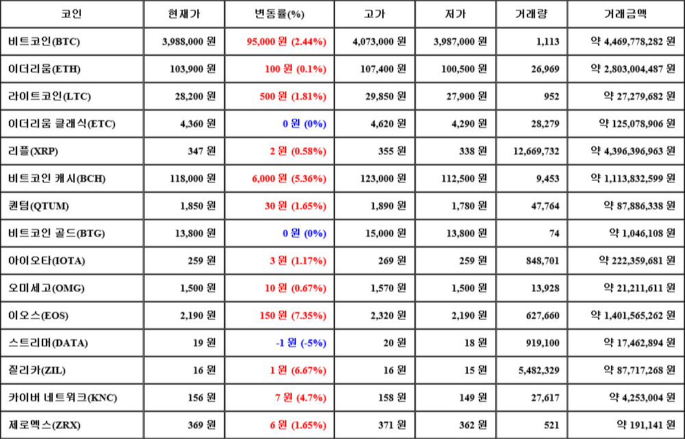 현재 암호화폐 거래소 "코인원"에 따르면 가상화폐 대장 격인 비트코인의 시세는 24시간 전 대비 95,000원(2.44%) 상승한 3,988,000원에 거래되고 있다.