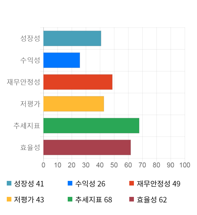 AI 인공지능 종목 분석 시스템을 이용해 성장성, 수익성, 효율성, 안전성, 저평가성, 추세 등 주가 수익률에 영향을 줄 수 있는 6가지 핵심 투자 지표를 점수화하여 종목의 투자 매력도를 계산해보았다.