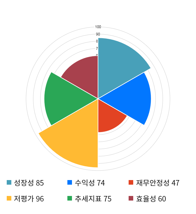 AI 인공지능 종목 분석 시스템을 이용해 성장성, 수익성, 효율성, 안전성, 저평가성, 추세 등 주가 수익률에 영향을 줄 수 있는 6가지 핵심 투자 지표를 점수화하여 종목의 투자 매력도를 계산해보았다.
