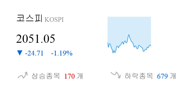 12월 10일 13시 0분 코스피는 전일 대비 24.71p(-1.19%) 하락한 2051.05p를 기록하고 있다.