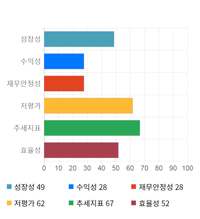 AI 인공지능 종목 분석 시스템을 이용해 성장성, 수익성, 효율성, 안전성, 저평가성, 추세 등 주가 수익률에 영향을 줄 수 있는 6가지 핵심 투자 지표를 점수화하여 종목의 투자 매력도를 계산해보았다.