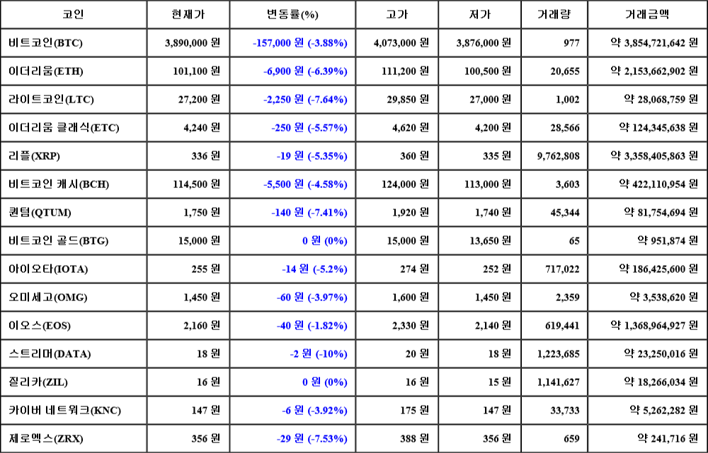 현재 암호화폐 거래소 "코인원"에 따르면 가상화폐 대장 격인 비트코인의 시세는 24시간 전 대비 157,000원(-3.88%) 하락한 3,890,000원에 거래되고 있다.