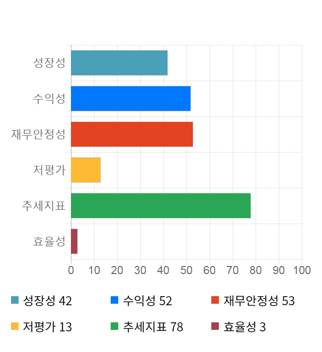 AI 인공지능 종목 분석 시스템을 이용해 성장성, 수익성, 효율성, 안전성, 저평가성, 추세 등 주가 수익률에 영향을 줄 수 있는 6가지 핵심 투자 지표를 점수화하여 종목의 투자 매력도를 계산해보았다.