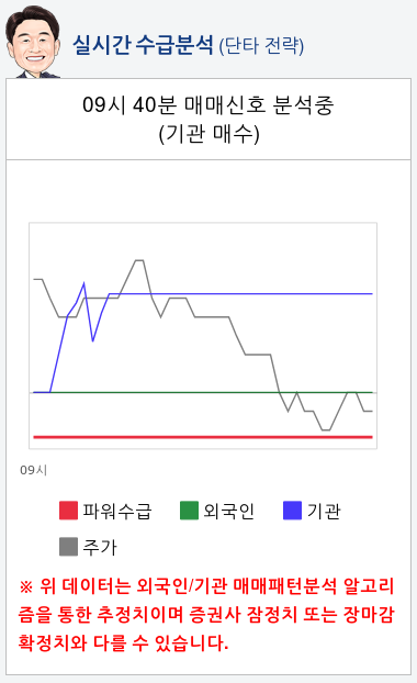 외국인, 기관 수급을 보면 외국인은 2일 연속매수하고 있고, 기관은 4일 연속 매도하였다. 알파고는 외국인, 기관의 추가 매수 가능성을 7%로 예상하고 있다.