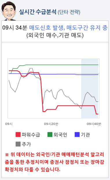 외국인, 기관 수급을 보면 외국인은 3일 연속매수하고 있고, 기관은 5일 연속 매도하였다. 알파고는 외국인, 기관의 추가 매수 가능성을 6%로 예상하고 있다.