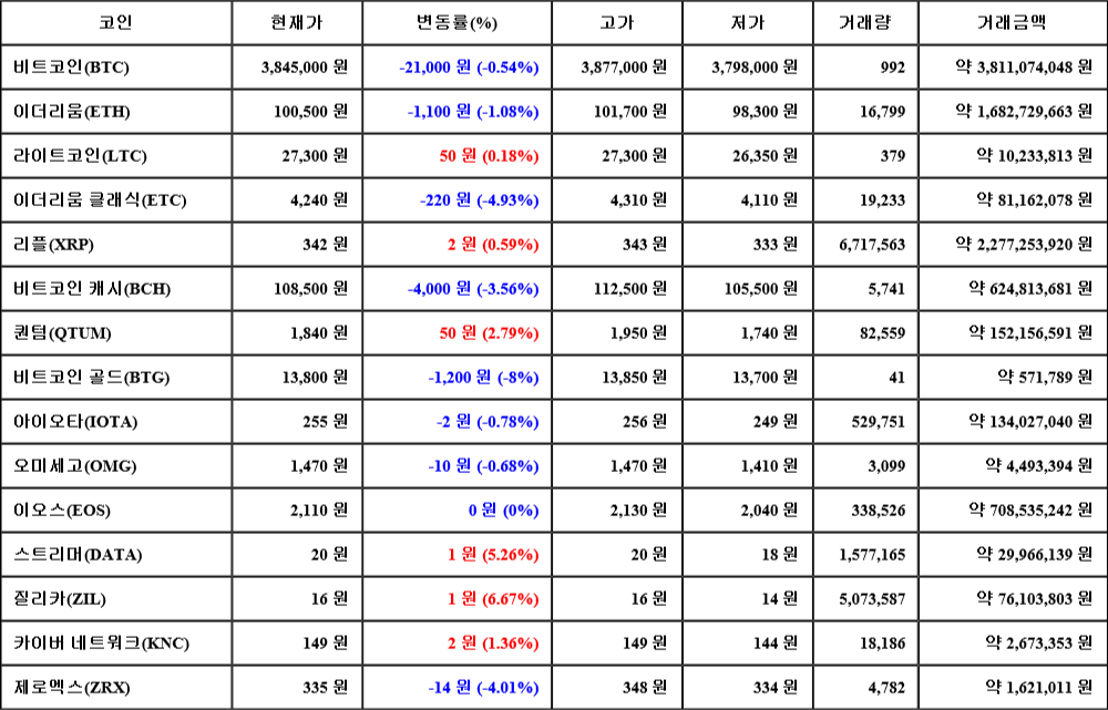현재 암호화폐 거래소 "코인원"에 따르면 가상화폐 대장 격인 비트코인의 시세는 24시간 전 대비 21,000원(-0.54%) 하락한 3,845,000원에 거래되고 있다.