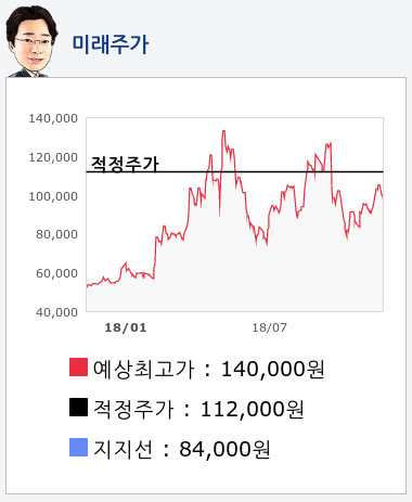 알파고의 재무데이터 분석 결과에 따르면 적정주가는 112,000원을 예상하고 있으며, 목표주가는 140,000원, 지지선은 84,000원 으로 예상하고 있다.