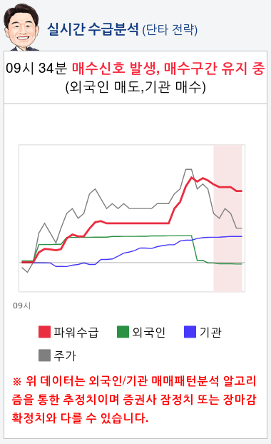 외국인, 기관 수급을 보면 외국인은 매도전환하고 있고, 기관은 2일 연속 매수하였다. 알파고는 외국인, 기관의 추가 매수 가능성을 18%로 예상하고 있다.