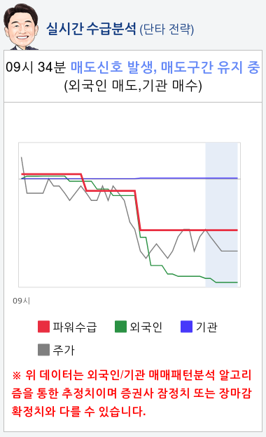 알파고가 분석한 CMG제약 종목의 외국인·기관 당일 실시간 수급은 현재 외국인은 매도하고 있고 기관은 매수하고 있으며, 종합 수급분석 평가지표인 파워수급은 09시 34분 부터 현재까지 매도 에너지가 더 높은 것으로 분석하고 있다.
