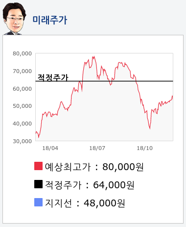 알파고의 재무데이터 분석 결과에 따르면 적정주가는 64,000원을 예상하고 있으며, 목표주가는 80,000원, 지지선은 48,000원 으로 예상하고 있다.