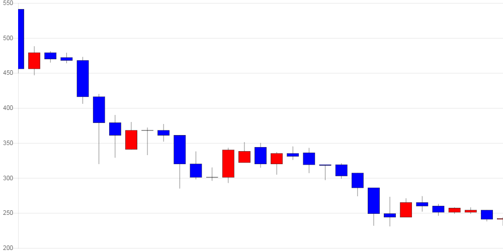 최근 1개월 고점은 512원이었으며, 현재 가격은 고점 대비 48.24% 수준이다.