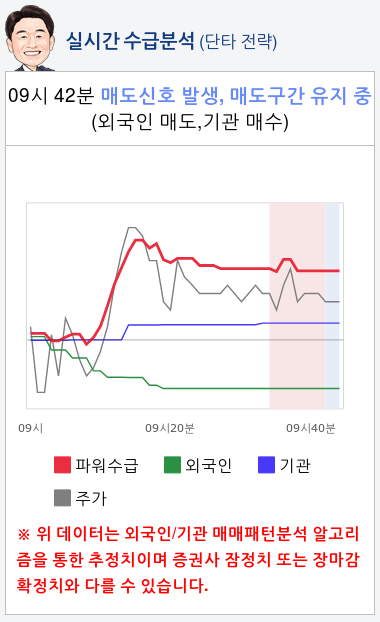 외국인, 기관 수급을 보면 외국인은 매수전환하고 있고, 기관은 2일 연속 매수하였다. 알파고는 외국인, 기관의 추가 매수 가능성을 48%로 예상하고 있다.