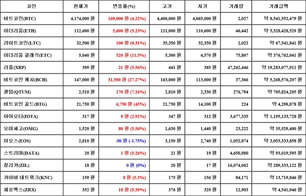 현재 암호화폐 거래소 "코인원"에 따르면 가상화폐 대장 격인 비트코인의 시세는 24시간 전 대비 169,000원(4.22%) 상승한 4,174,000원에 거래되고 있다.