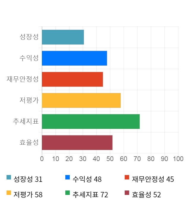 AI 인공지능 종목 분석 시스템을 이용해 성장성, 수익성, 효율성, 안전성, 저평가성, 추세 등 주가 수익률에 영향을 줄 수 있는 6가지 핵심 투자 지표를 점수화하여 종목의 투자 매력도를 계산해보았다.
