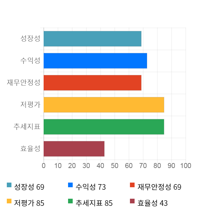 AI 인공지능 종목 분석 시스템을 이용해 성장성, 수익성, 효율성, 안전성, 저평가성, 추세 등 주가 수익률에 영향을 줄 수 있는 6가지 핵심 투자 지표를 점수화하여 종목의 투자 매력도를 계산해보았다.
