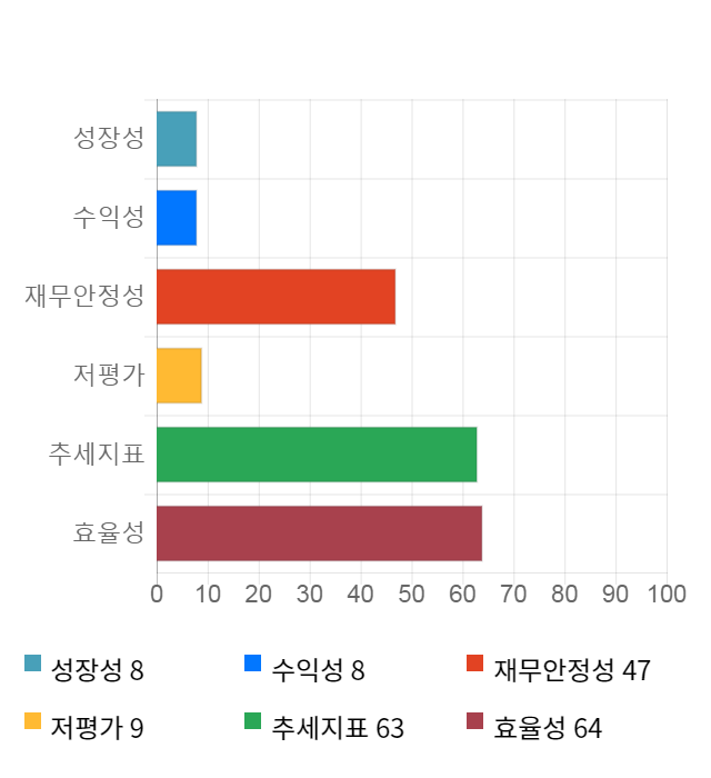 AI 인공지능 종목 분석 시스템을 이용해 성장성, 수익성, 효율성, 안전성, 저평가성, 추세 등 주가 수익률에 영향을 줄 수 있는 6가지 핵심 투자 지표를 점수화하여 종목의 투자 매력도를 계산해보았다.