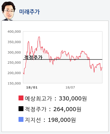 알파고의 재무데이터 분석 결과에 따르면 적정주가는 264,000원을 예상하고 있으며, 목표주가는 330,000원, 지지선은 198,000원 으로 예상하고 있다.