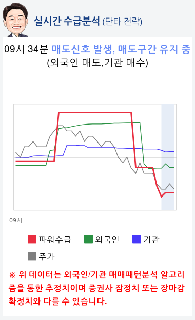 알파고가 분석한 셀트리온 종목의 외국인·기관 당일 실시간 수급은 현재 외국인은 매도하고 있고 기관은 매수하고 있으며, 종합 수급분석 평가지표인 파워수급은 09시 34분 부터 현재까지 매도 에너지가 더 높은 것으로 분석하고 있다.