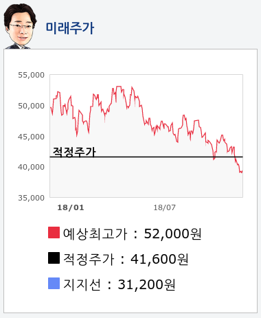 알파고의 재무데이터 분석 결과에 따르면 적정주가는 41,600원을 예상하고 있으며, 목표주가는 52,000원, 지지선은 31,200원 으로 예상하고 있다.
