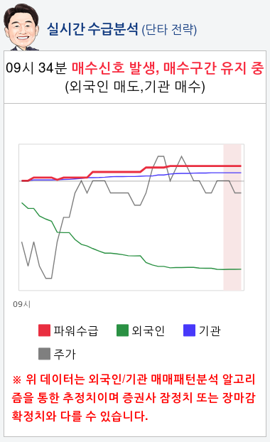 알파고가 분석한 삼성전자 종목의 외국인·기관 당일 실시간 수급은 현재 외국인은 매도하고 있고 기관은 매수하고 있으며, 종합 수급분석 평가지표인 파워수급은 09시 34분 부터 현재까지 매수 에너지가 더 높은 것으로 분석하고 있다.