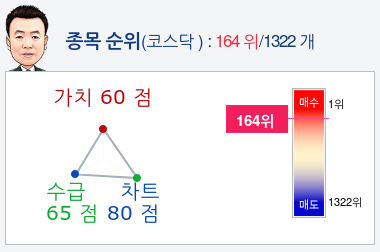알파고가 가치, 수급, 차트로 평가한 대아티아이종목의 현재 종합순위는 코스닥 1322개 종목 중 164위로, 알파고는 대아티아이기업의 수급을 높게 평가 분석하고 있다.