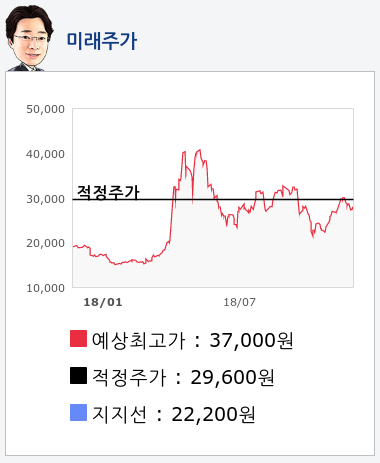 알파고의 재무데이터 분석 결과에 따르면 적정주가는 29,600원을 예상하고 있으며, 목표주가는 37,000원, 지지선은 22,200원 으로 예상하고 있다.
