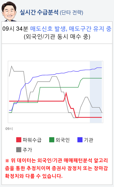 외국인, 기관 수급을 보면 외국인은 매수전환하고 있고, 기관은 매수전환하였다. 알파고는 외국인, 기관의 추가 매수 가능성을 80%로 예상하고 있다.