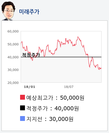 알파고의 재무데이터 분석 결과에 따르면 적정주가는 40,000원을 예상하고 있으며, 목표주가는 50,000원, 지지선은 30,000원 으로 예상하고 있다.