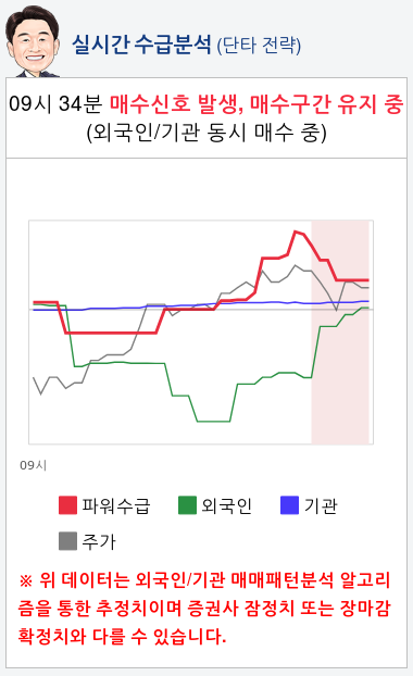 외국인, 기관 수급을 보면 외국인은 2일 연속매수하고 있고, 기관은 매도전환하였다. 알파고는 외국인, 기관의 추가 매수 가능성을 36%로 예상하고 있다.