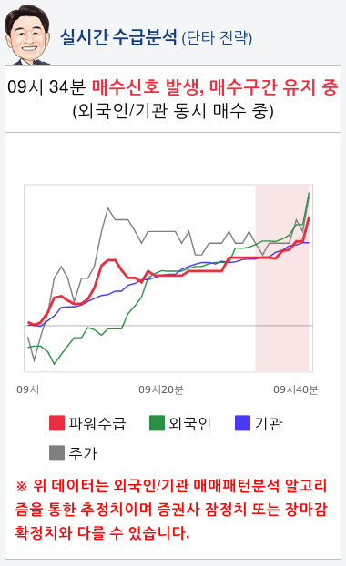 외국인, 기관 수급을 보면 외국인은 2일 연속매수하고 있고, 기관은 2일 연속 매수하였다. 알파고는 외국인, 기관의 추가 매수 가능성을 68%로 예상하고 있다.