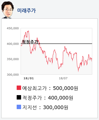 알파고의 재무데이터 분석 결과에 따르면 적정주가는 400,000원을 예상하고 있으며, 목표주가는 500,000원, 지지선은 300,000원 으로 예상하고 있다.