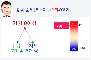 알파고가 가치, 수급, 차트로 평가한 LG화학종목의 현재 종합순위는 코스피 896개 종목 중 2위로, 알파고는 LG화학기업의 가치와 수급와 차트을 높게 평가 분석하고 있다.